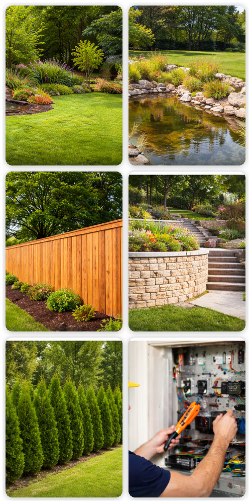 From landscaping and backyard ponds to fences, retaining walls, privacy tree lines, and expert electrical work — we deliver clean craftsmanship, durable results, and a property you’ll love coming home to.